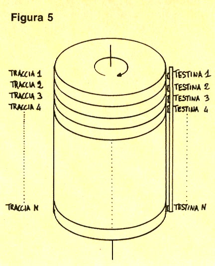L'ultimo dispositivo che descriveremo in questa sede, è l'unità a tamburo mostrato schematicamente in fig.5. Come è facile notare, si tratta si un semplice cilindro sulla cui superficie laterale è disposto il materiale magnetico. Come i dischi, anche il tamburo gira continuamente ed è suddiviso in tracce, sulle quali vengono incisi i vari blocchi separati come sempre da un gap. Infine una serie di testine fisse (una per ogni traccia) ha l'effettivo compito di eseguire le operazioni di lettura e scrittura dei blocchi.