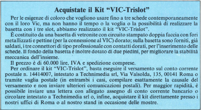 Nell'articolo in questione, pubblicato a pagina 41 di MC n. 16, in realtà venivano proposte tre distinte soluzioni per collegare contemporaneamente più espansioni, ma quella certamente più pulita era senza dubbio l'adattatore esterno, proposto ai lettori anche come kit da ordinare via Posta. Nel senso che toccava andare in un ufficio postale ed effettuare il versamento tramite ccp o vaglia e attendere, non si sa quanto, che l'attrezzo venisse prima o poi recapitato a casa.