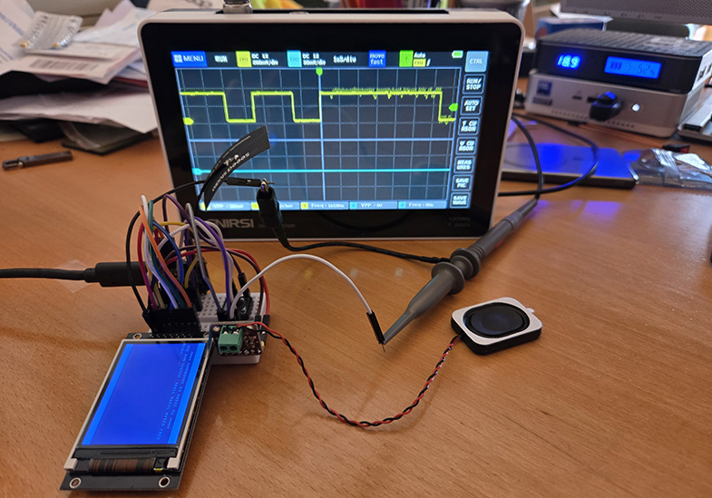 Ho dovuto scomodare anche l'oscilloscopio a un certo punto: il segnale digitale c'è, ma sull'uscita audio non arriva nulla. Ripeto, solo con l'emulatore di mezzo. Ormai siamo arrivati - Google Drive non mente - alla trentacinquesima versione dei file... trentacinquesima compilazione... trentacinquesimo fallimento!