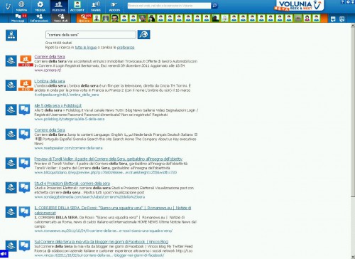 Di diverso troviamo una barra superiore (che rimarrà lì anche durante la navigazione successiva alla ricerca) e una serie di icone accanto ai risultati di ricerca. Queste ci permetteranno di sapere quanti utenti (sempre tramite Volunia, NON in assoluto... sia ben chiaro!) stanno visualizzando in quel momento quelle pagine e/o di investigare i contenuti di quei siti prima ancora di accedervi.